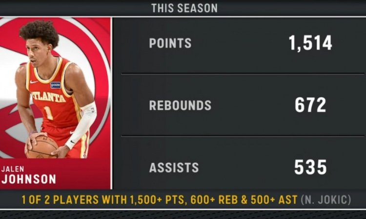 本赛季仅两人达成至少1500分600板500助:杰伦·约翰逊 约基奇